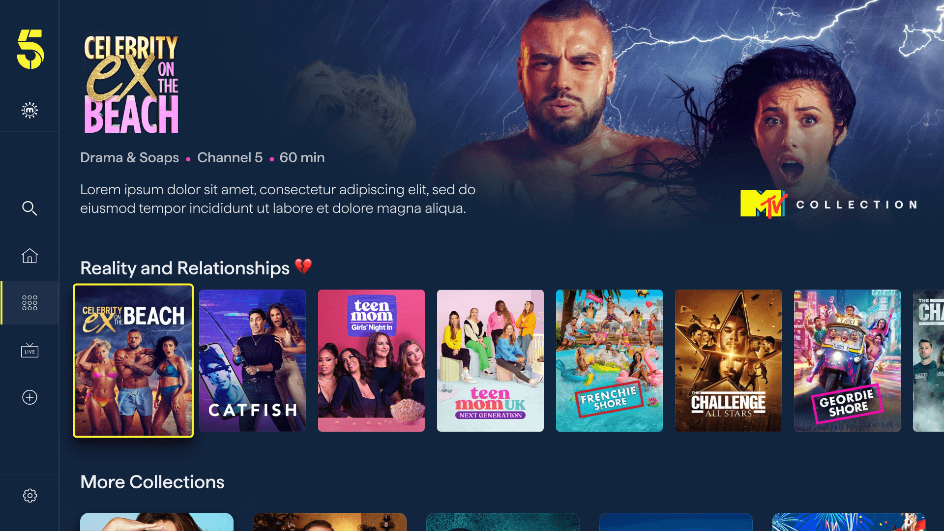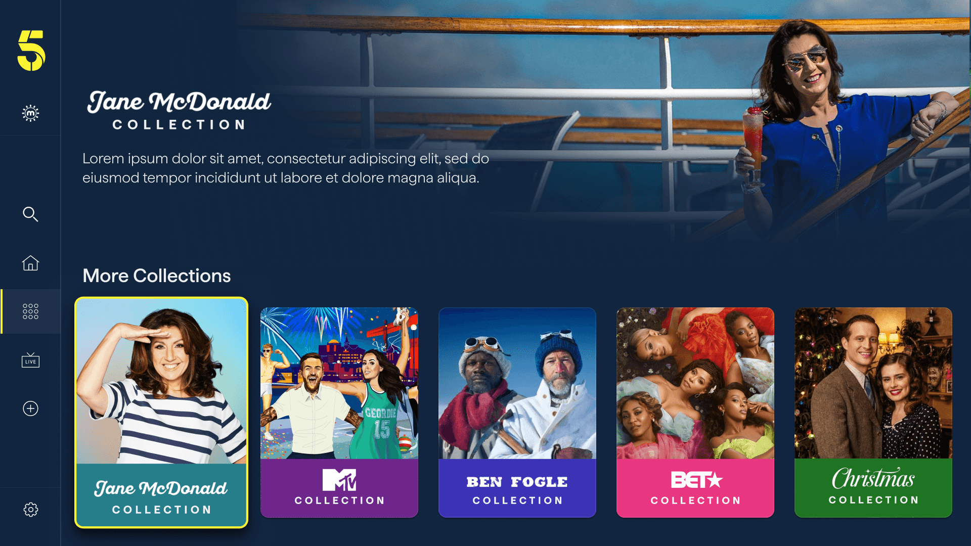 Collections was introduced to give Channel 5's editorial team far greater creative control — the ability to package content around a brand partnership, a cultural moment, a genre mood, or a talent relationship, and present it with its own visual identity and narrative. Think "MTV Collection," "Jane McDonald Collection," or "True Crime Collection," each with a distinct look and feel within the same app.