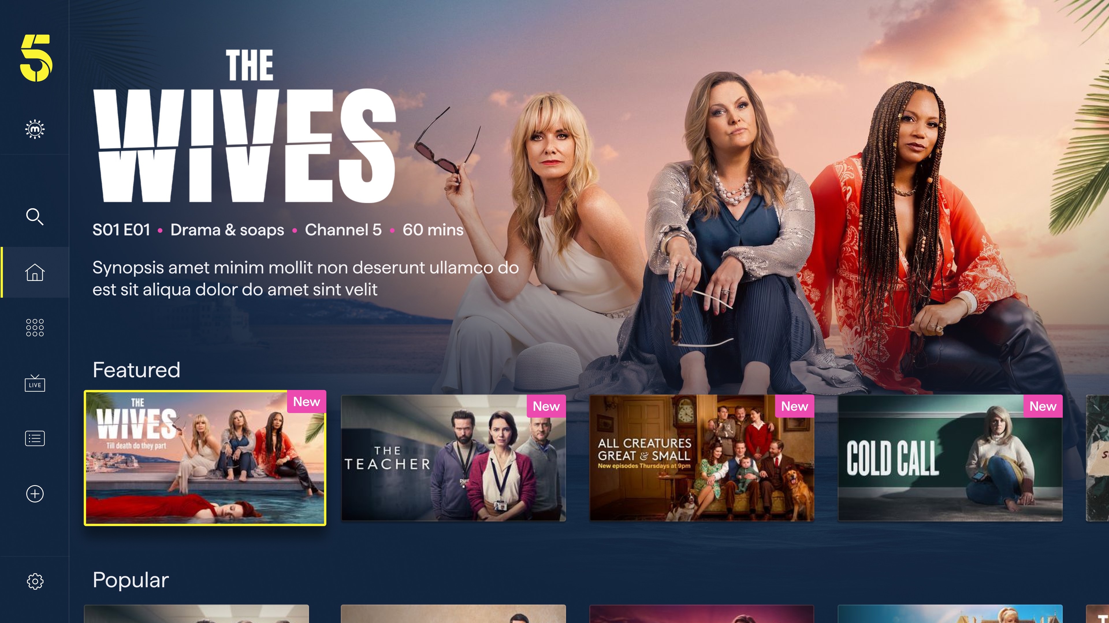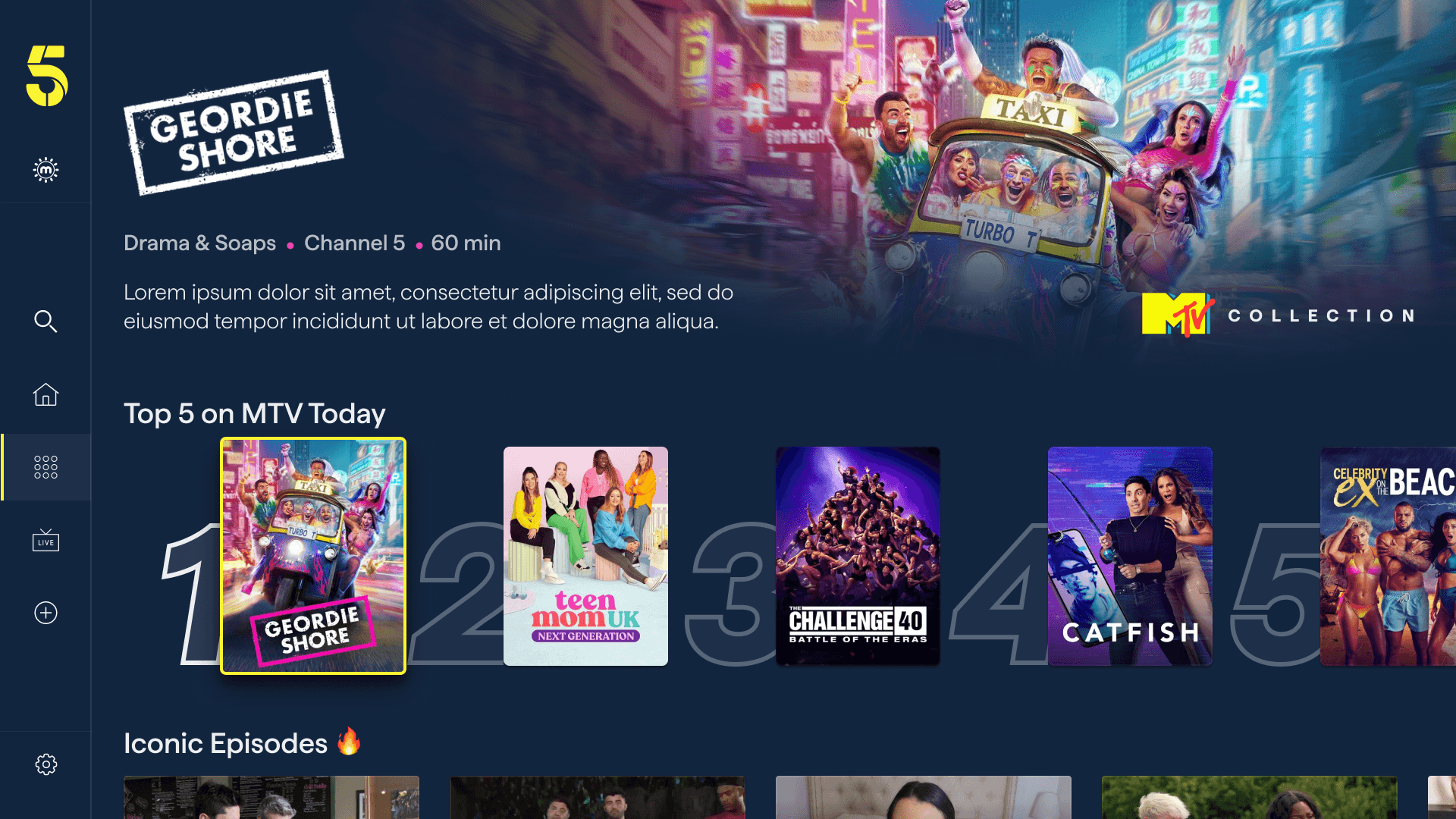 As part of Channel 5's wider rebrand, My5 was relaunched as "5" — unifying the brand across broadcast and digital. As lead designer, I was responsible for translating the new visual identity across every screen: introducing a bold design language centred on ink blue, vivid yellow, and energetic pink, while also redesigning and improving core user journeys.