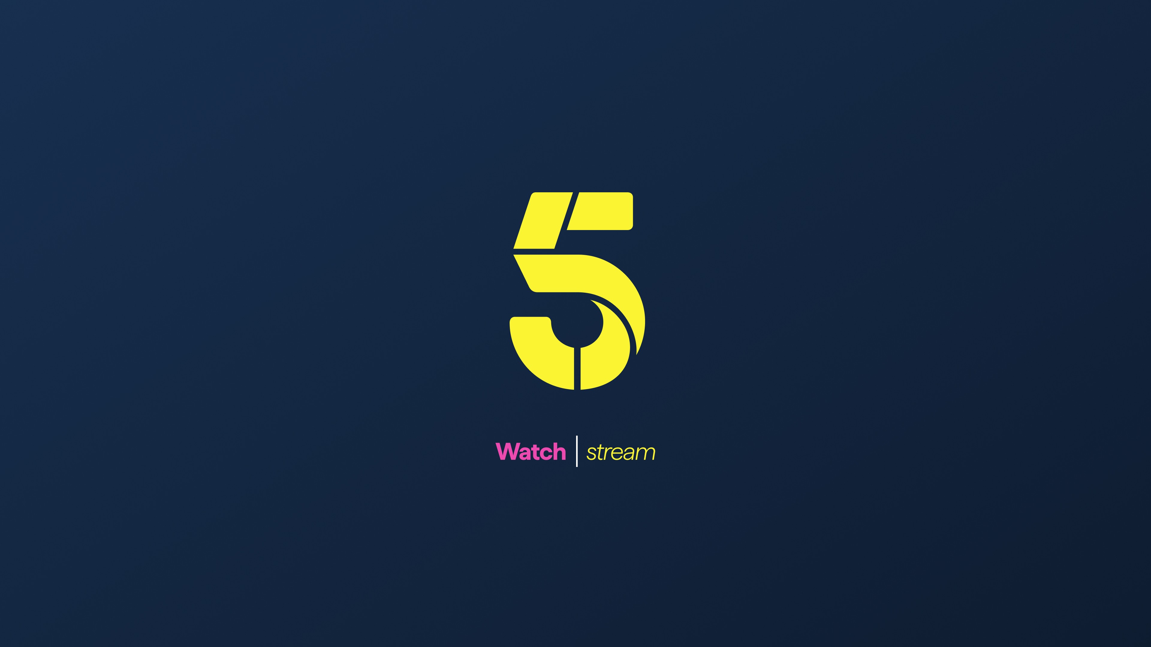 The rebrand begins at the first touchpoint. The yellow "5" mark on a deep ink blue background replaces the My5 identity immediately. The splash screen introduces the "Watch | stream" line, reinforcing 5's identity as both a live broadcaster and an on-demand platform.