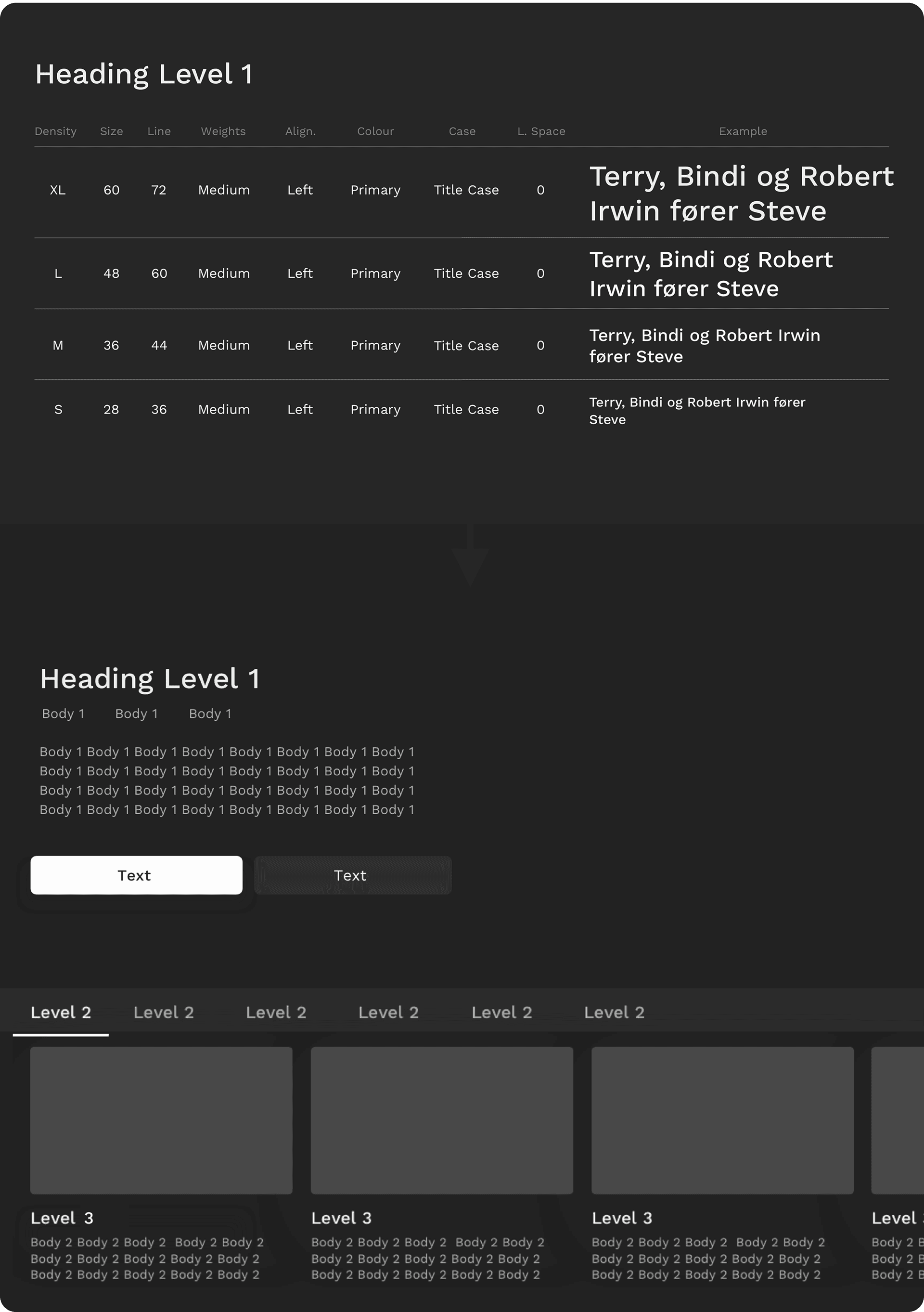 Our typography guidelines are thoughtfully organised into distinct levels, including Level 1, Level 2, Body 1, Body 2, and more. Each level is meticulously designed to provide a structured typographic hierarchy within our system. From prominent headings to body text, these levels offer a scalable and harmonious approach to font sizes, styles, and spacing. By employing this tiered system, we ensure consistency, readability, and visual coherence across various components and layouts.