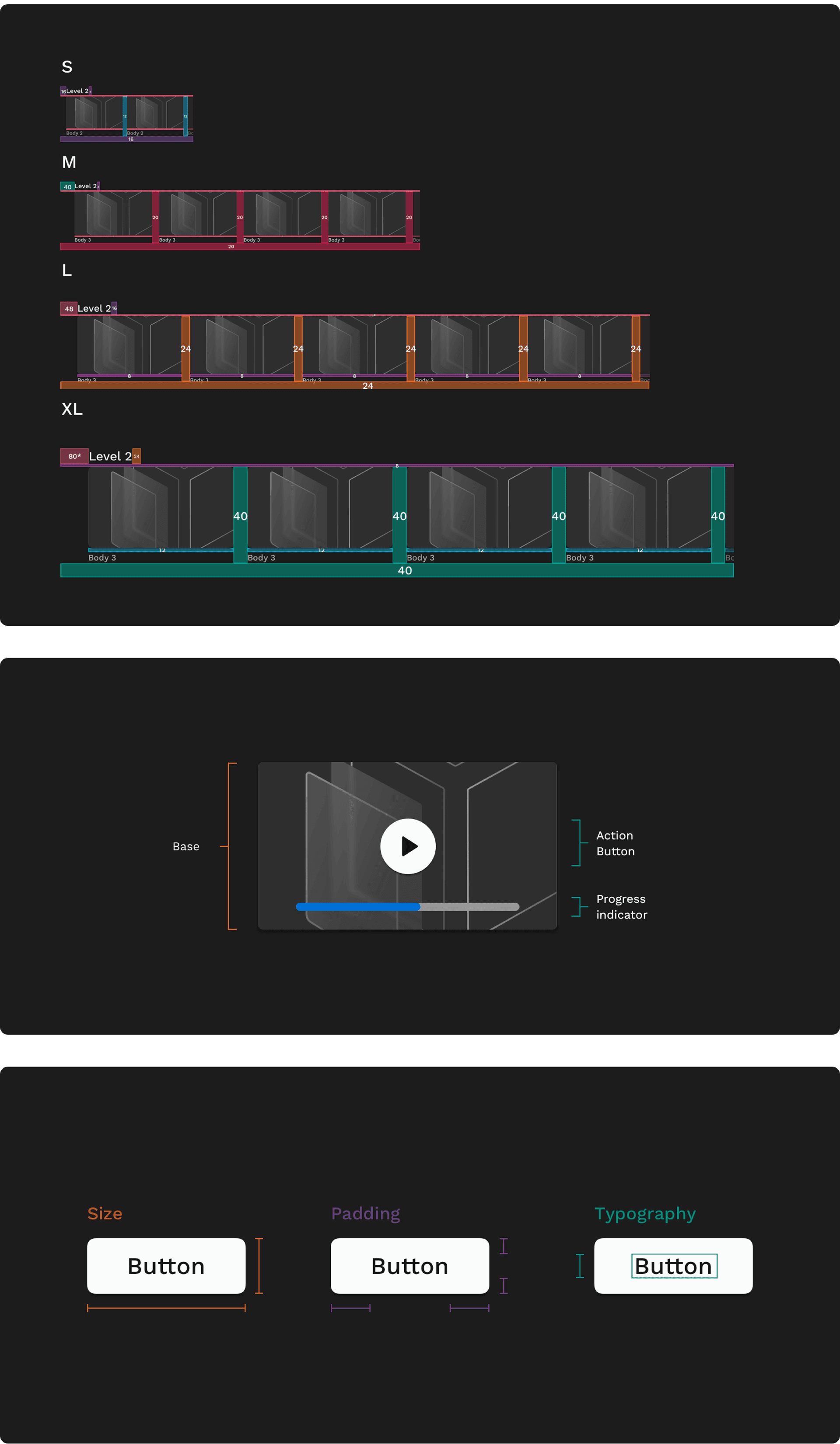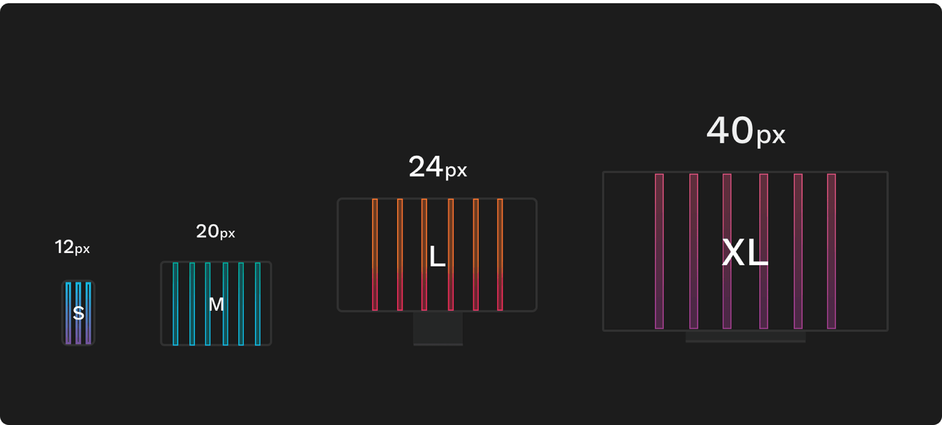 Our component sizing is categorised into four distinct levels - Small (S), Medium (M), Large (L), and Extra Large (XL). This tiered approach allows for flexible and scalable design, accommodating various screen sizes and ensuring a harmonious visual hierarchy. Each size category is thoughtfully calibrated to provide a balanced and optimised user experience, contributing to a seamless and adaptable design system.
