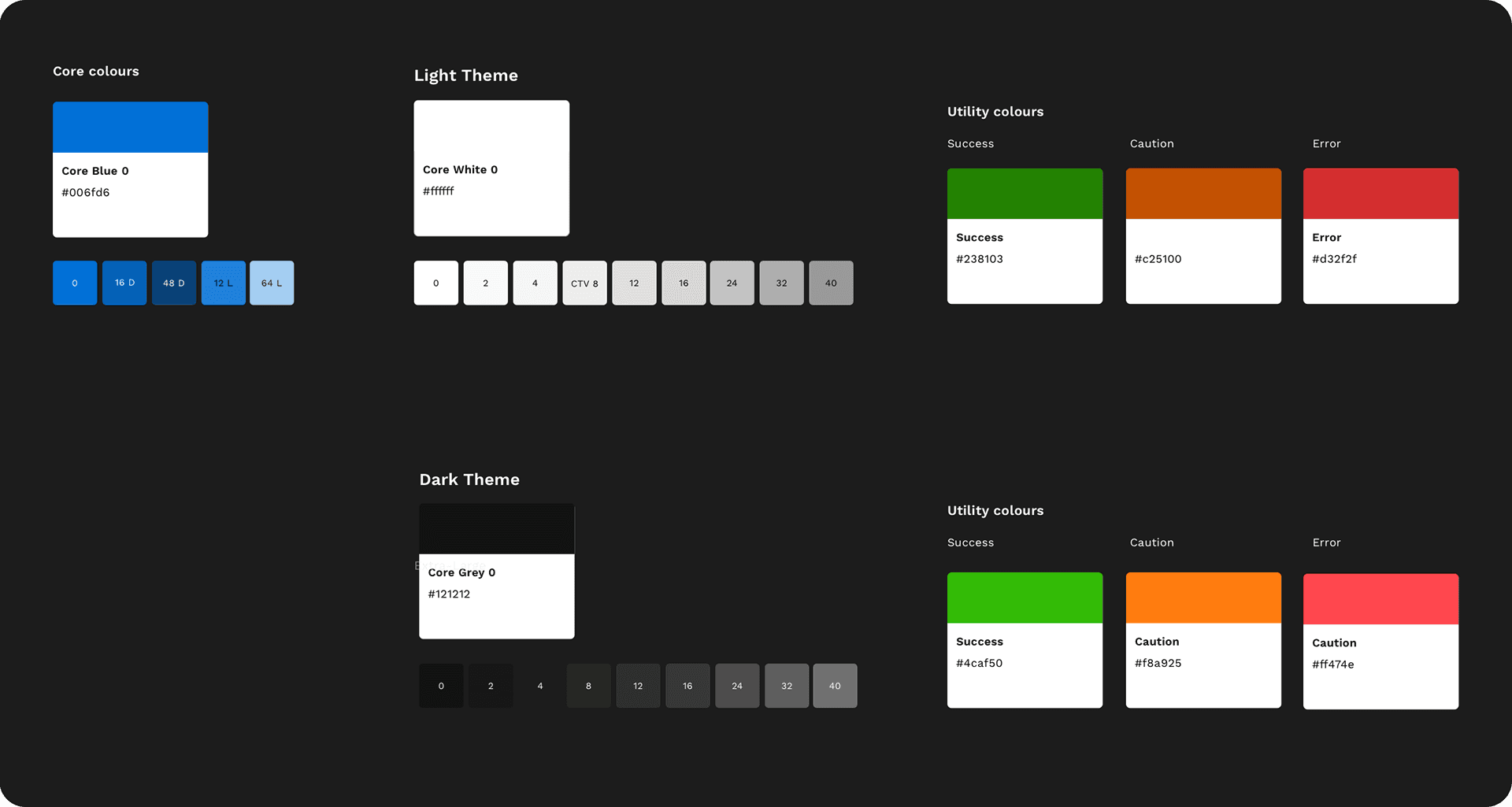 Our style guide defines the unique combinations of Colour, Shadow, Outline, and Elevation that personalise each component based on context and state. The system organises styles into two main themes: Dark Background and Light Background.