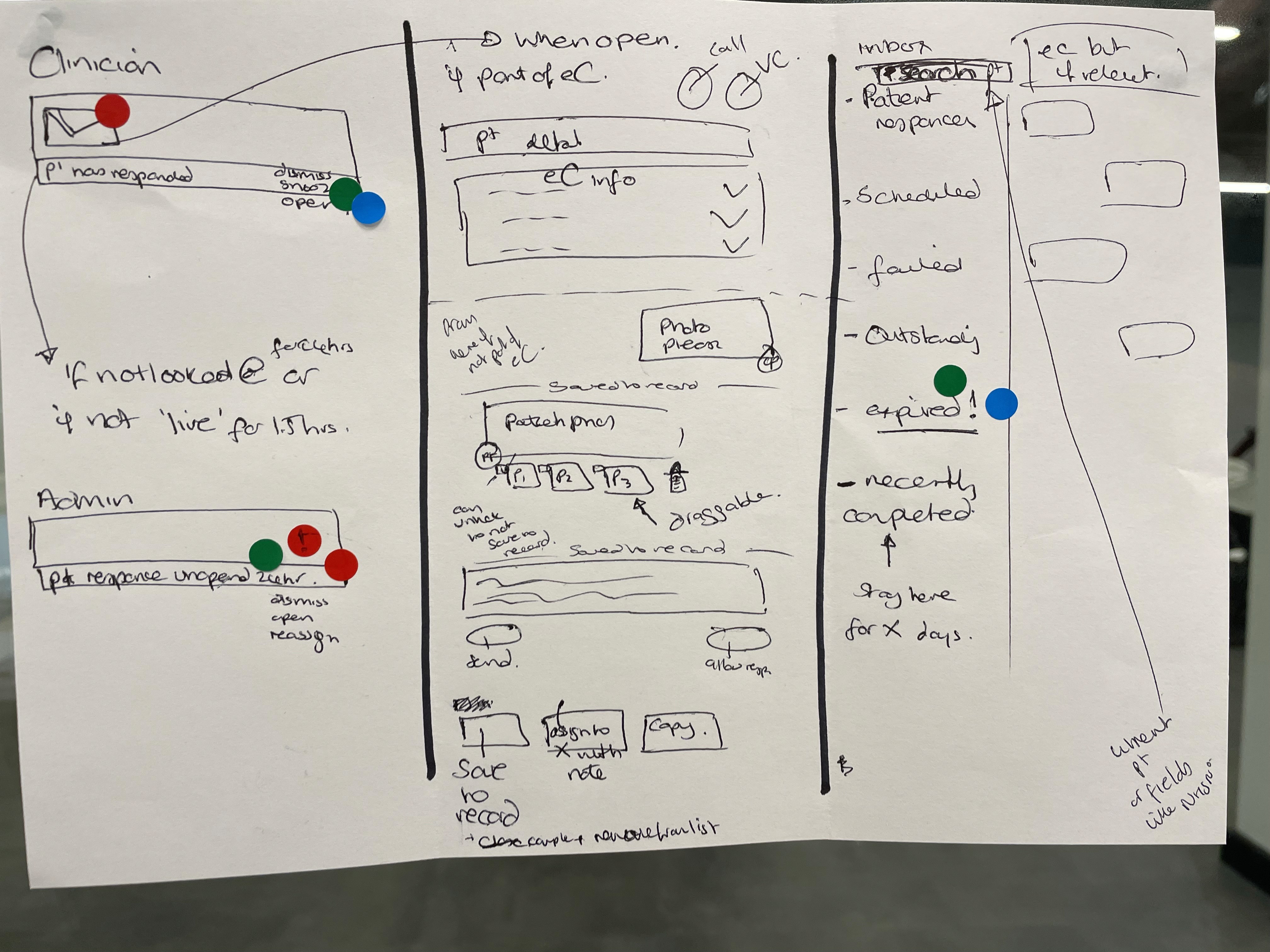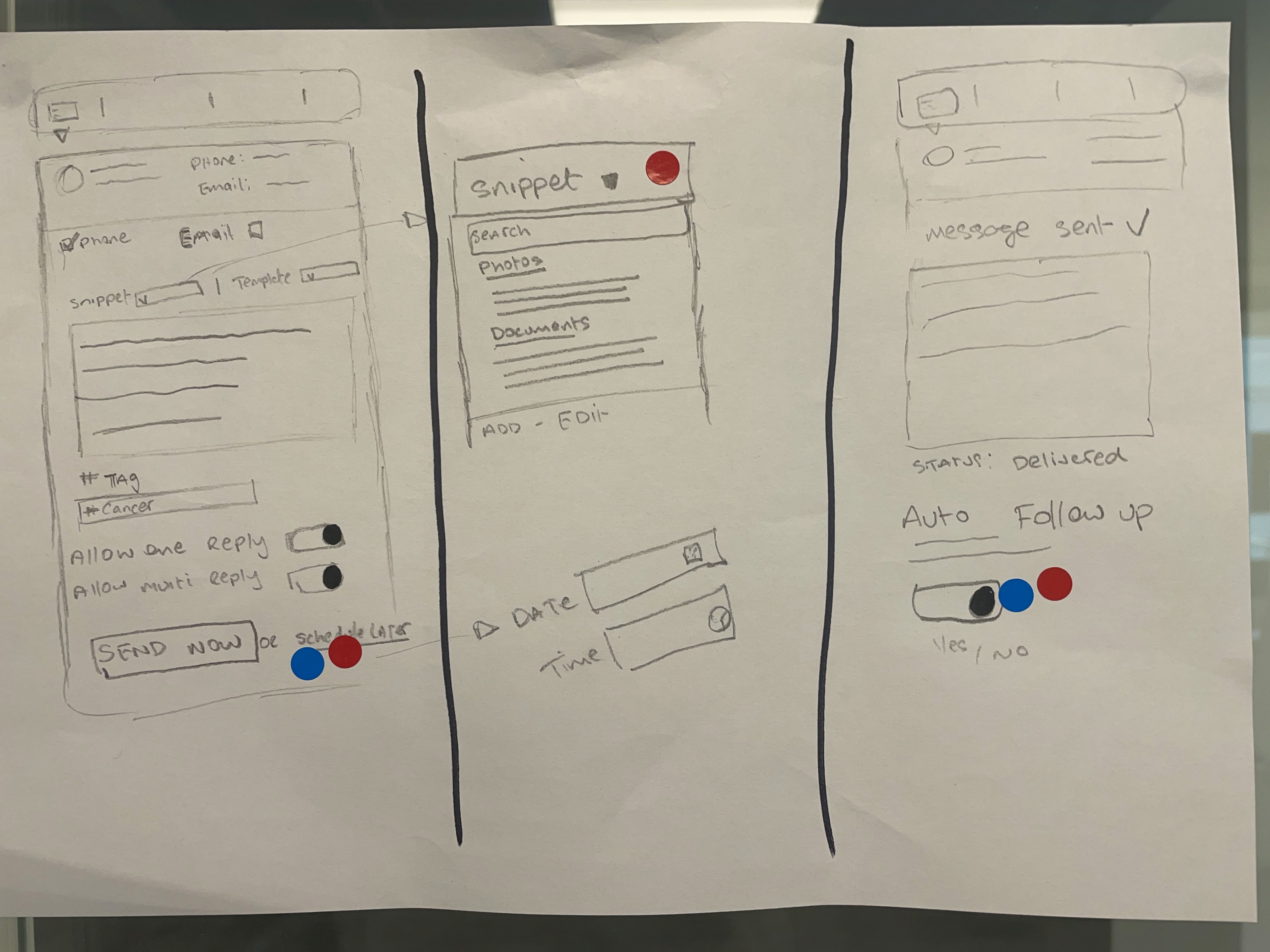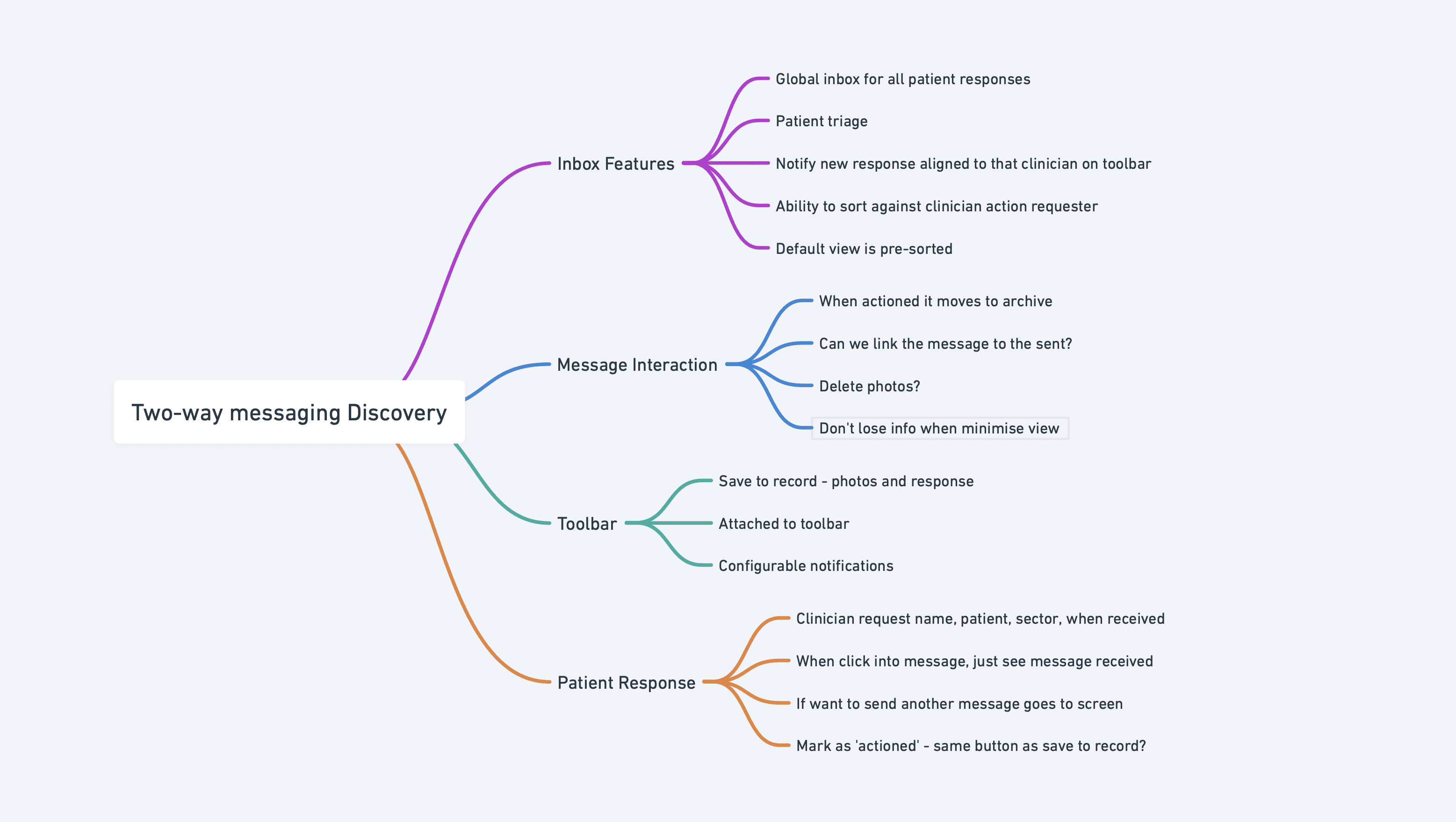 Message Management: We considered the necessity of linking incoming messages to previously sent ones for context, and explored the potential to mark messages as 'actioned' similarly to how photos are saved to patient records.