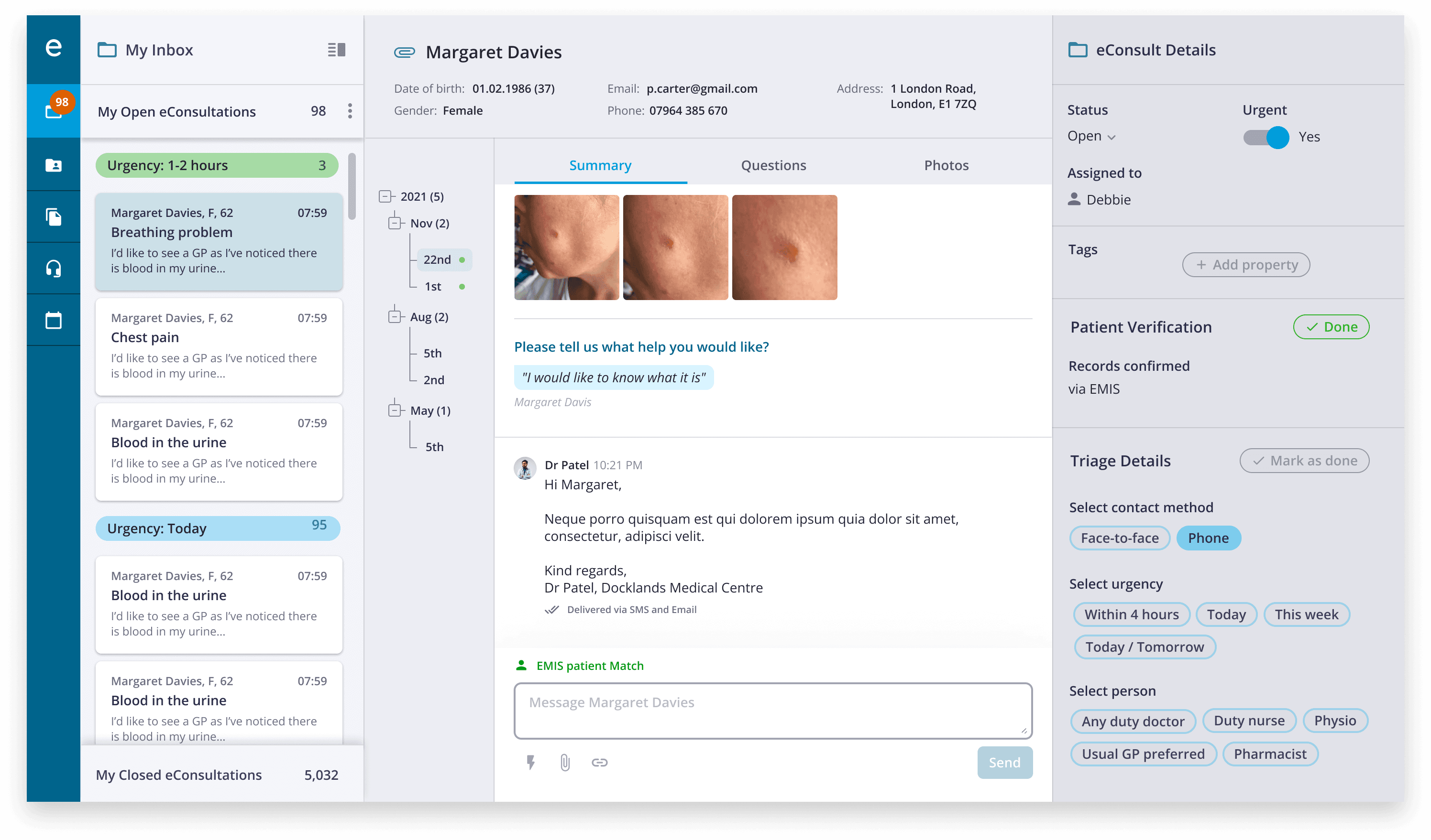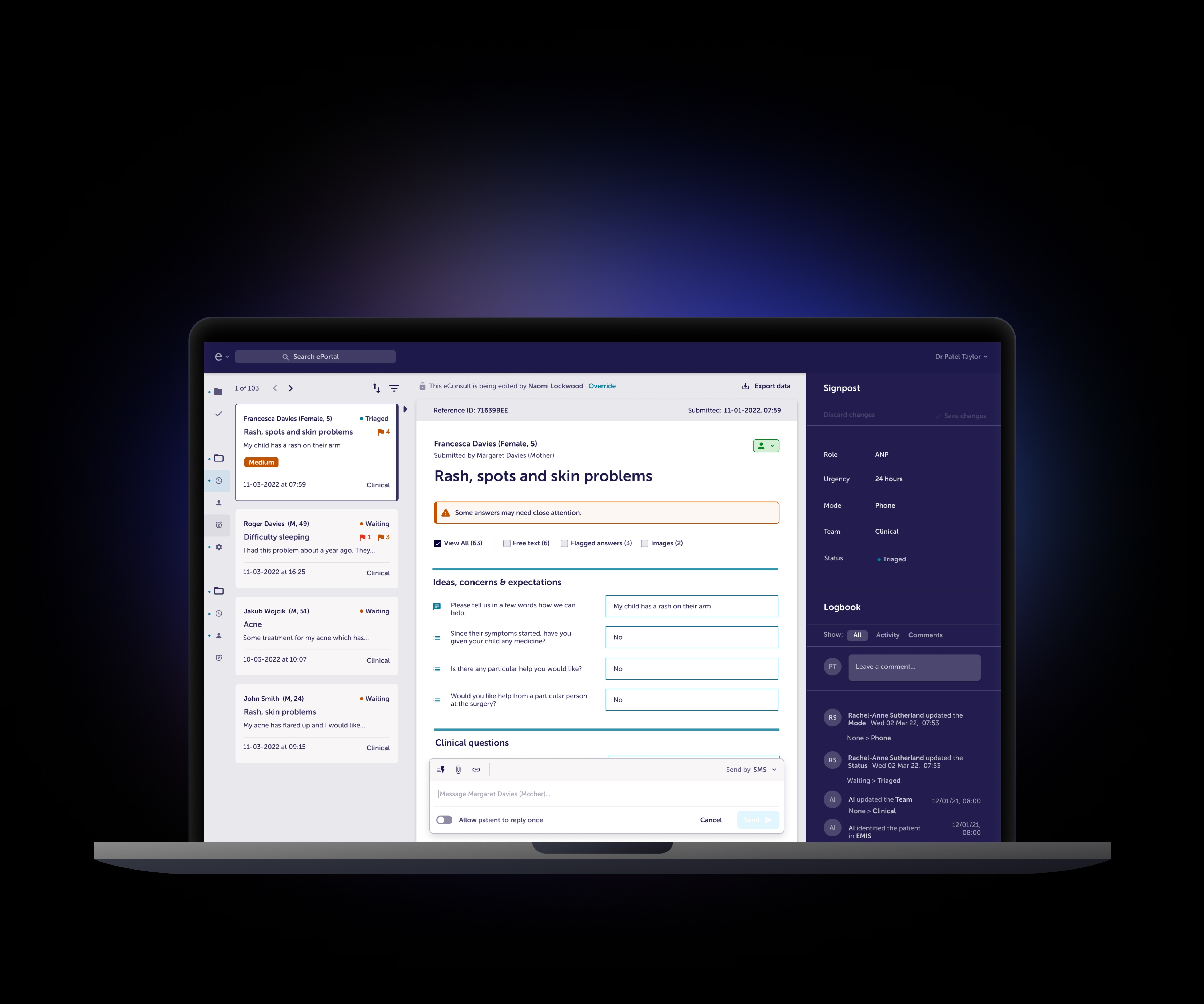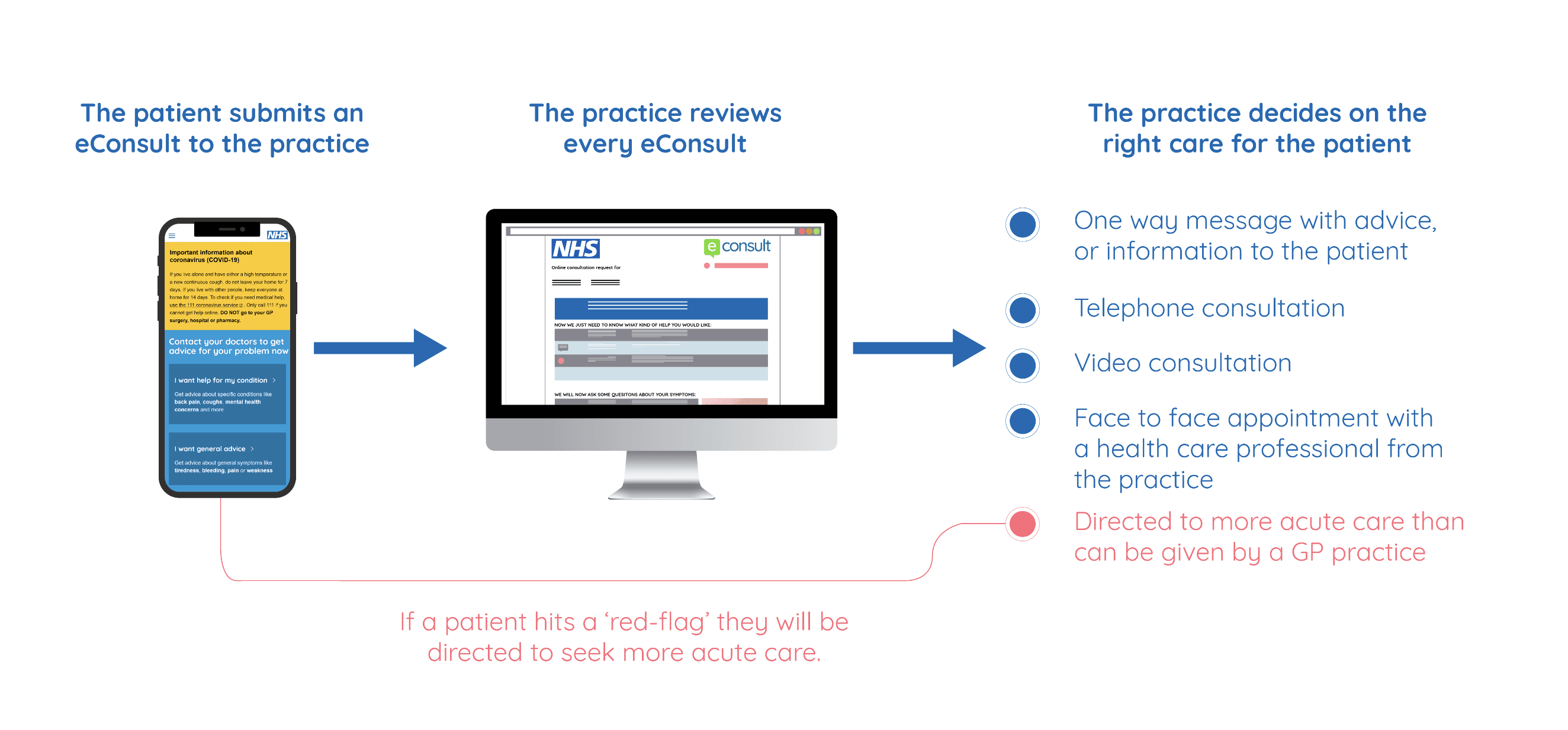 eConsult is a digital triage and online consultation platform that allows NHS GP practices to better understand the needs of their patients. By collecting rich, safe and structured patient information, patients can be better supported to get the right care at the right time and in the right place.