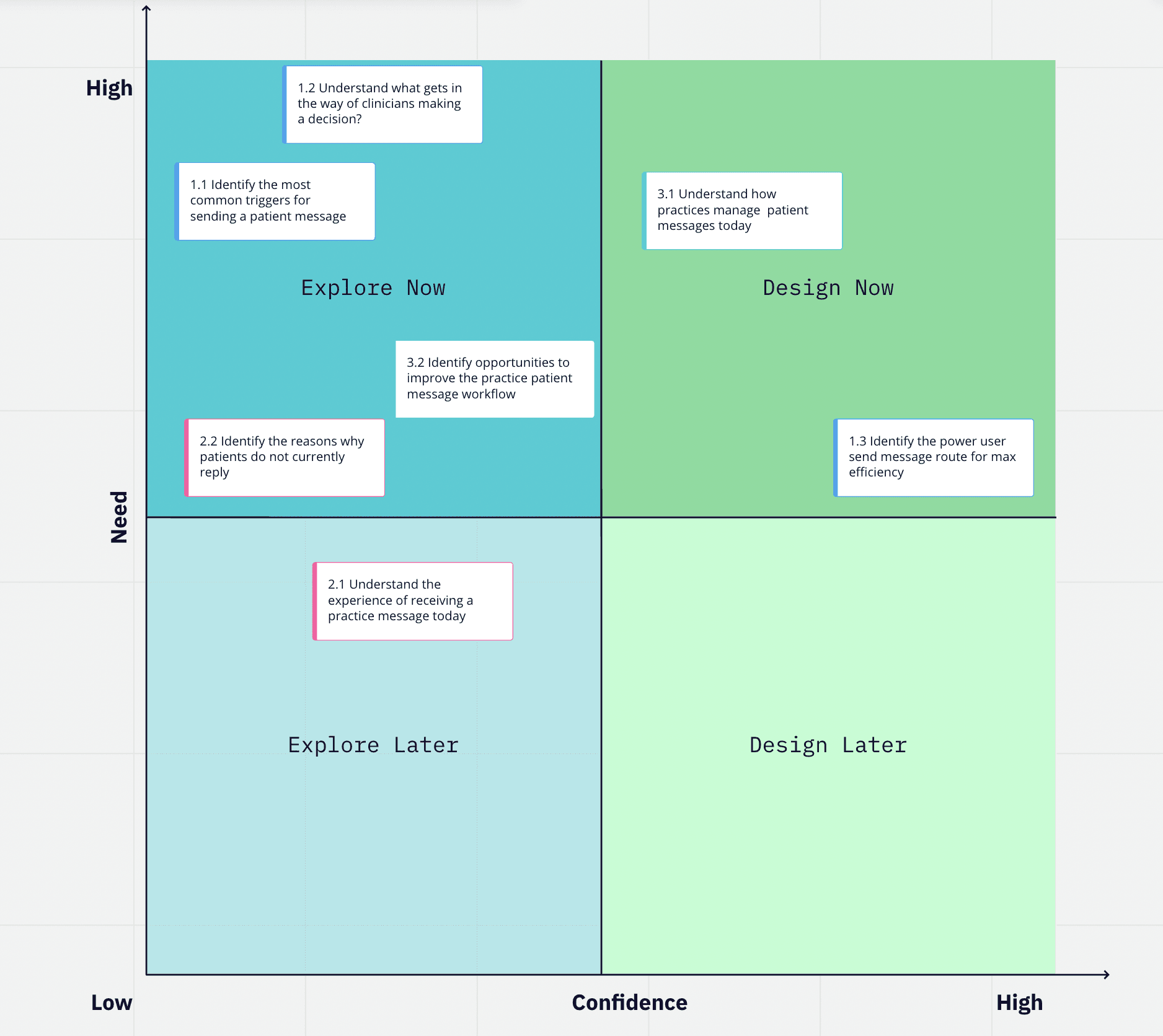 In our discovery phase, we identified key opportunities for improving the eConsult application. We prioritised enhancements using a need-confidence matrix, focusing on the introduction of a two-way messaging system. This feature aimed to automate patient-provider communication, reducing the need for time-consuming emails and calls.